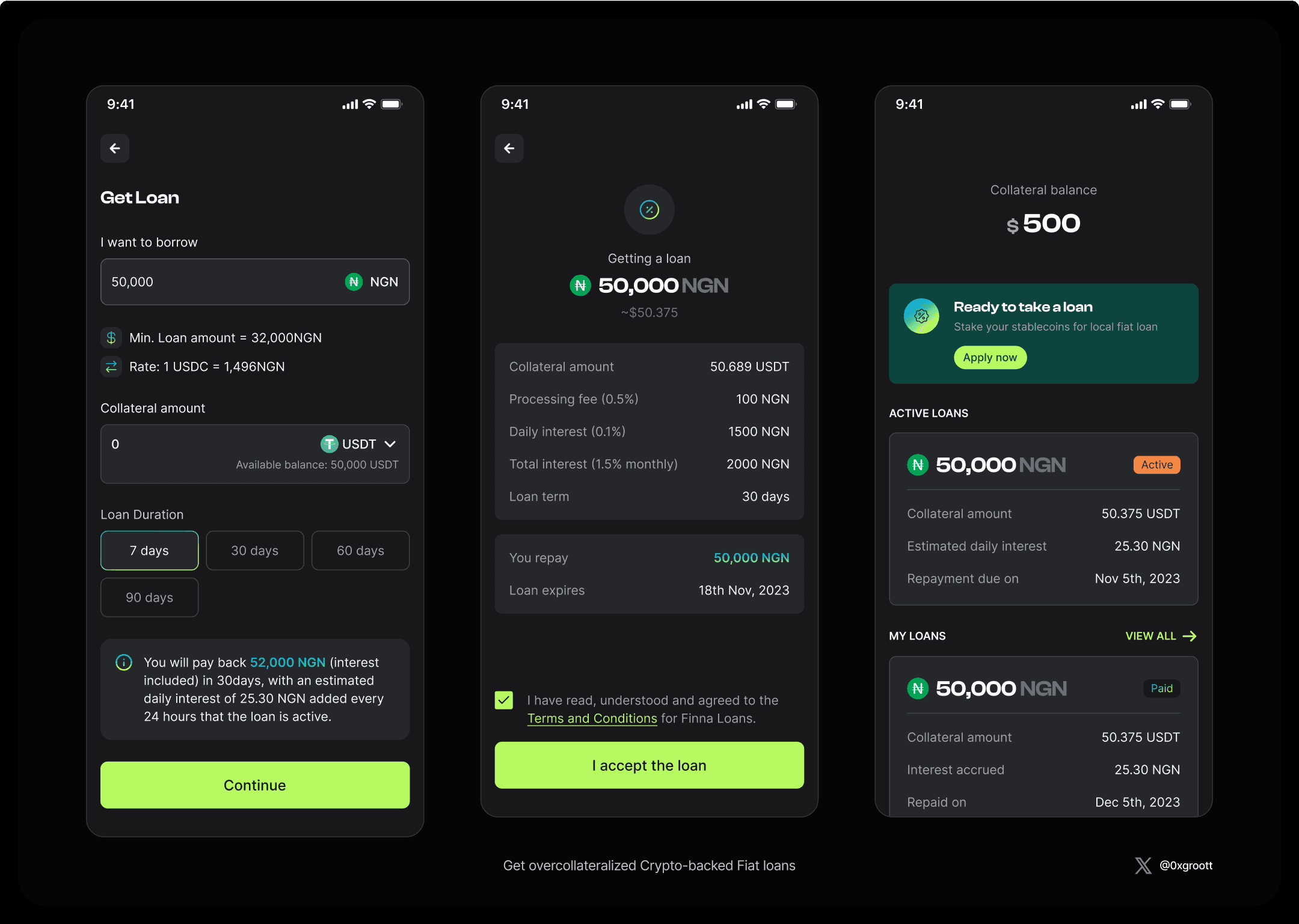 Overcollateralized Loans: Lock Stablecoins as collateral to access fiat loans (up to 90 days) with competitive interest rates (4% monthly on Finna, compared to 12% with local banks and 18% with regulated loan sharks in the country). When loans are repaid, Stablecoins are released back to the user - providing liquidity without selling assets.