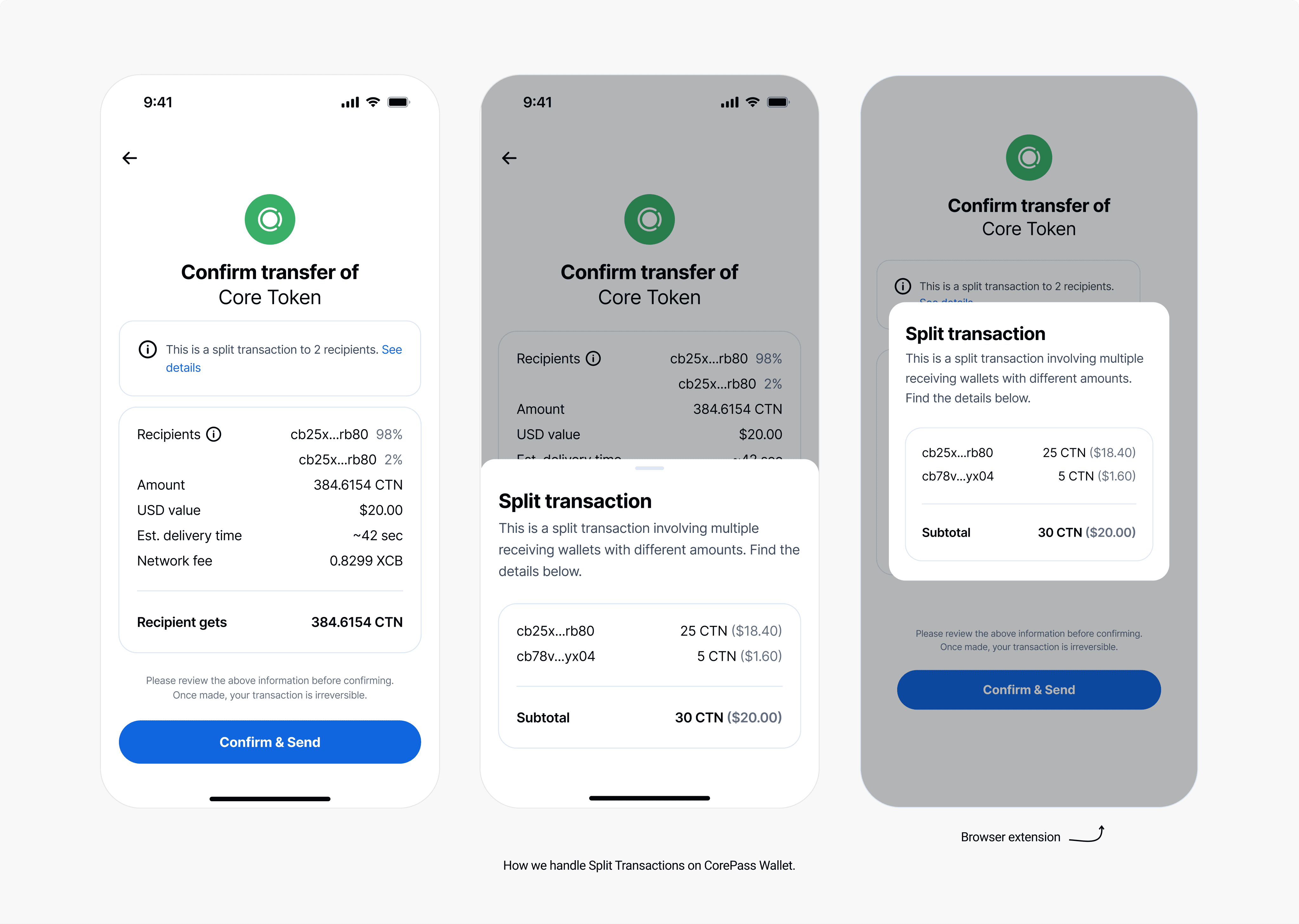 Gasless transactions, Split payments, and Security needed to work while respecting the CorePass mobile-first security model