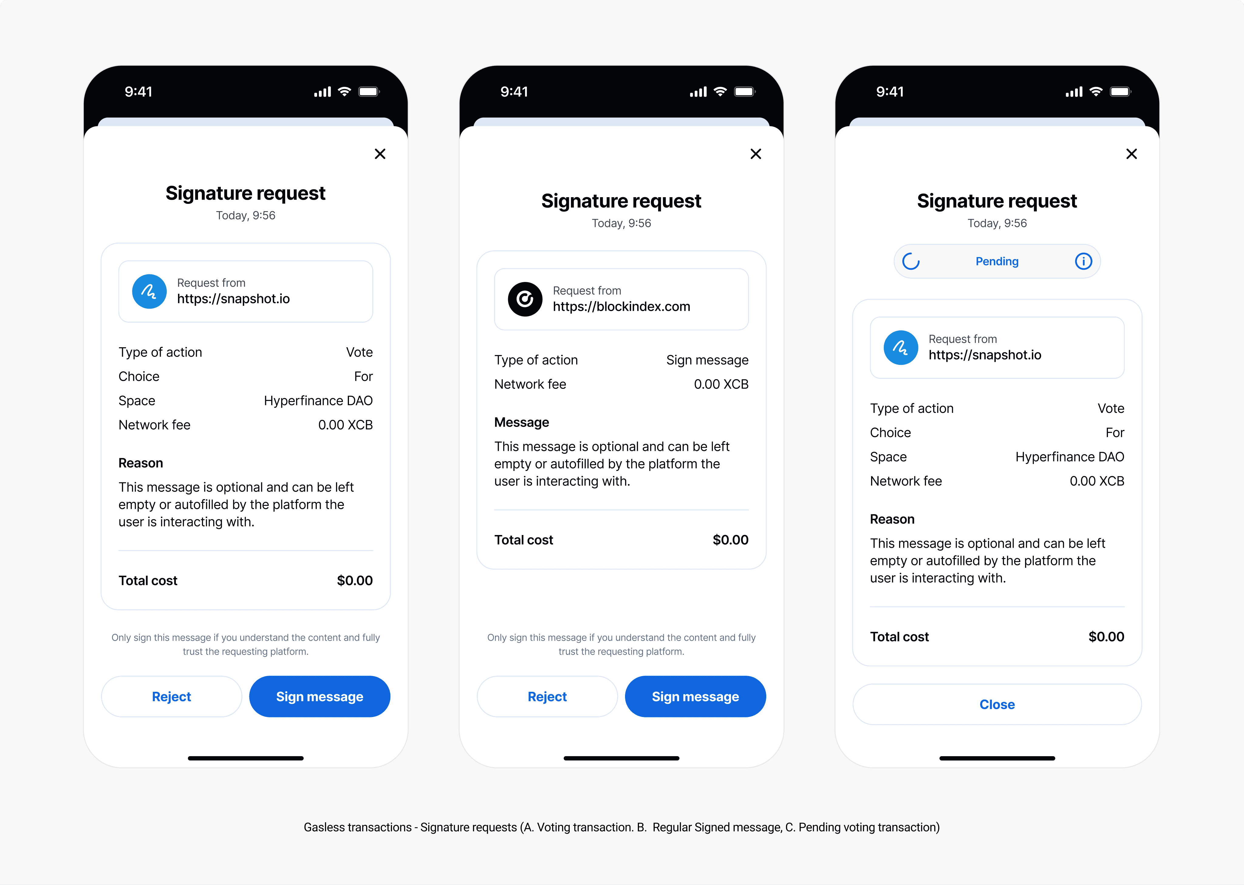 Trust Indicators I incorporated visual trust signals throughout the app, using verified request sources, clear network fee displays, and explicit "what happens next" messaging. For gasless transactions especially, I added contextual explainers to help users understand why they're signing and what permissions they're granting.