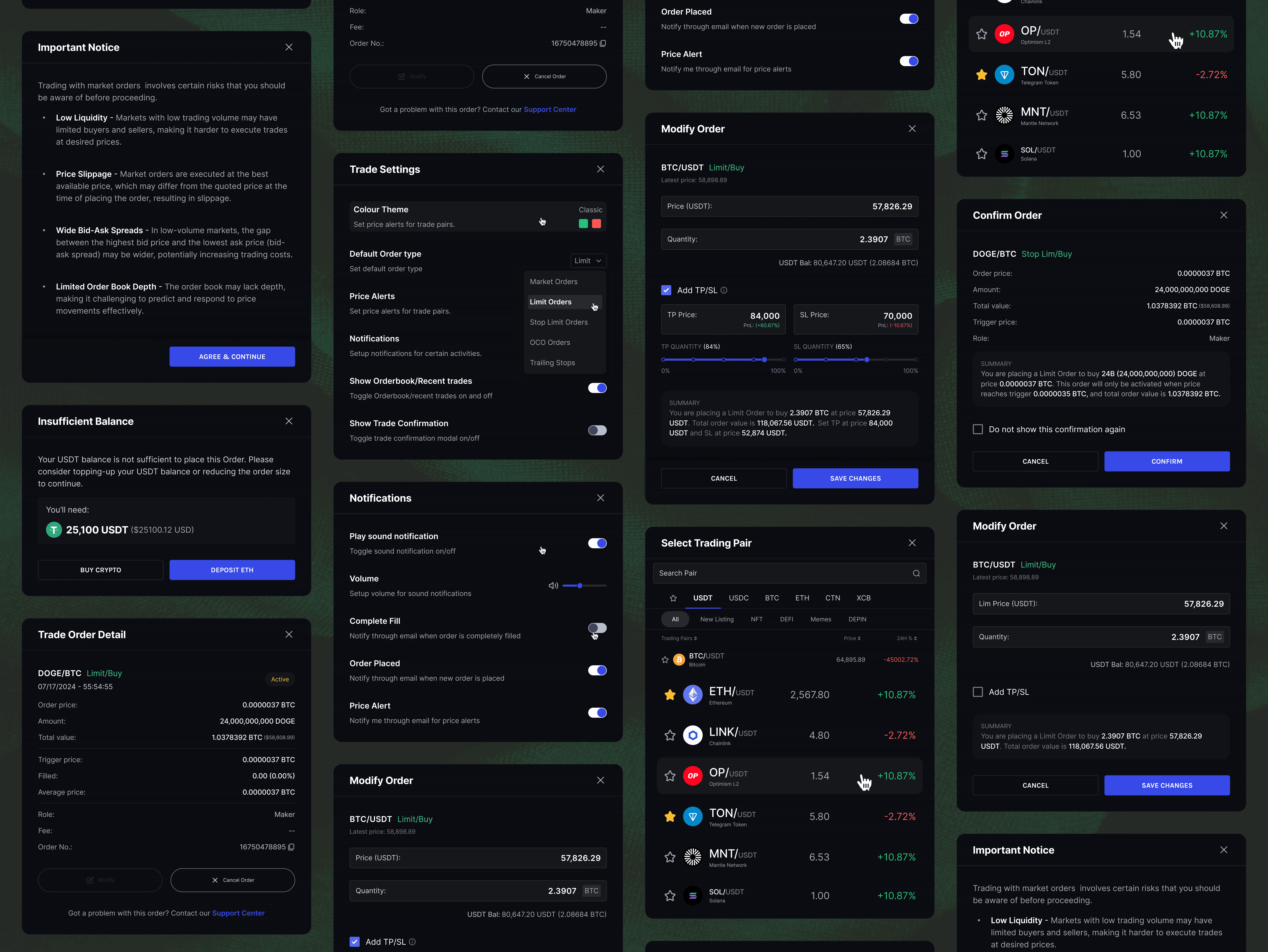 The existing trading interface was built from a template that didn't align with the brand or meet competitive industry standards. Users struggled with unclear feedback mechanisms; no confirmation signals or clarity when actions were taken. The platform lacked the professional tools traders expect from modern exchanges, making it difficult to compete with established platforms like Binance or Kraken.