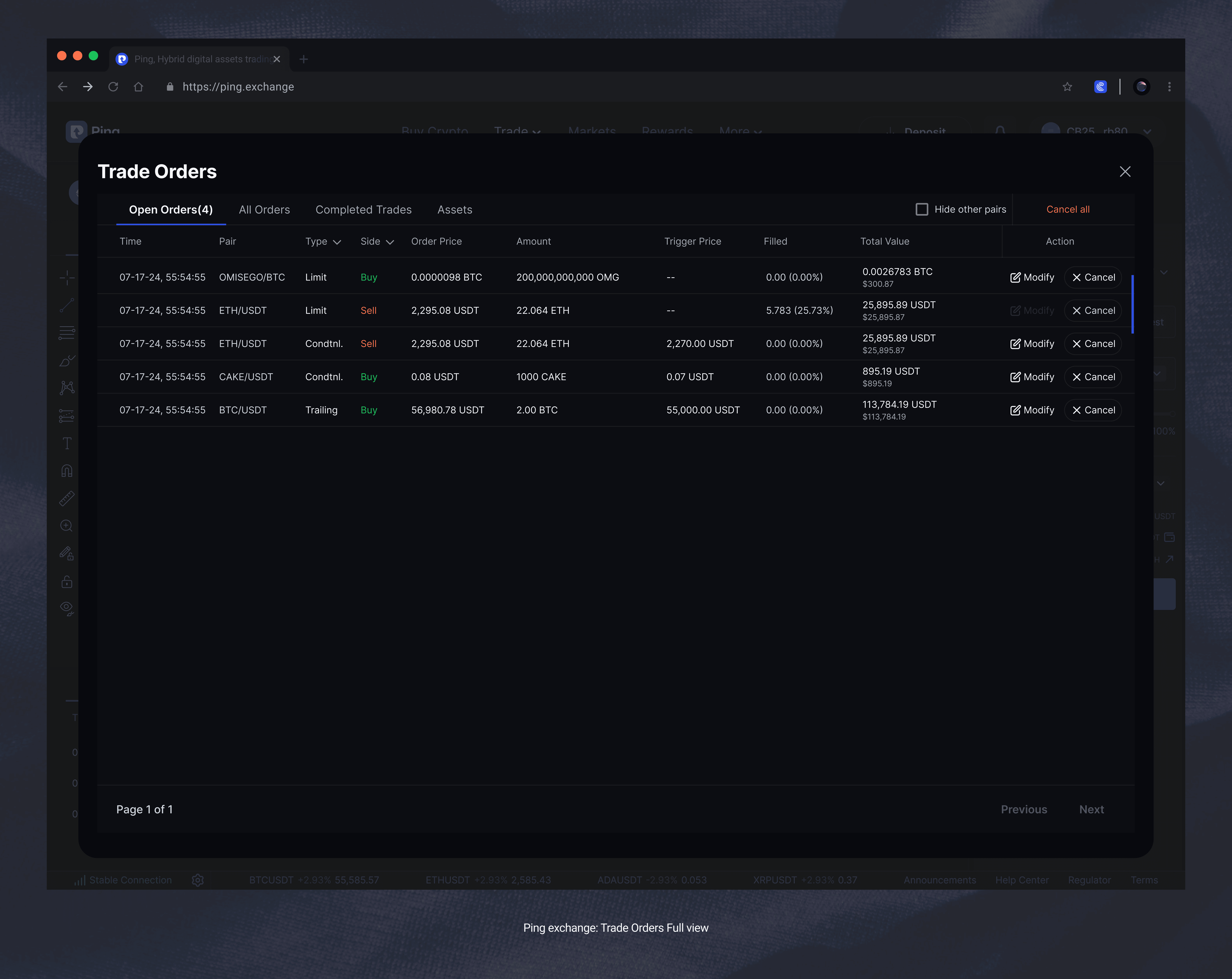 Orders can exist in multiple states: Active, Completed, Expired, and Cancelled. Clearly separating these states improves trader confidence and transparency. The tab system (Open Orders, All Orders, Completed Trades) allows users to quickly answer: Which orders are still live? Which trades executed? Which orders failed or expired? This clarity is essential for risk management and auditability.